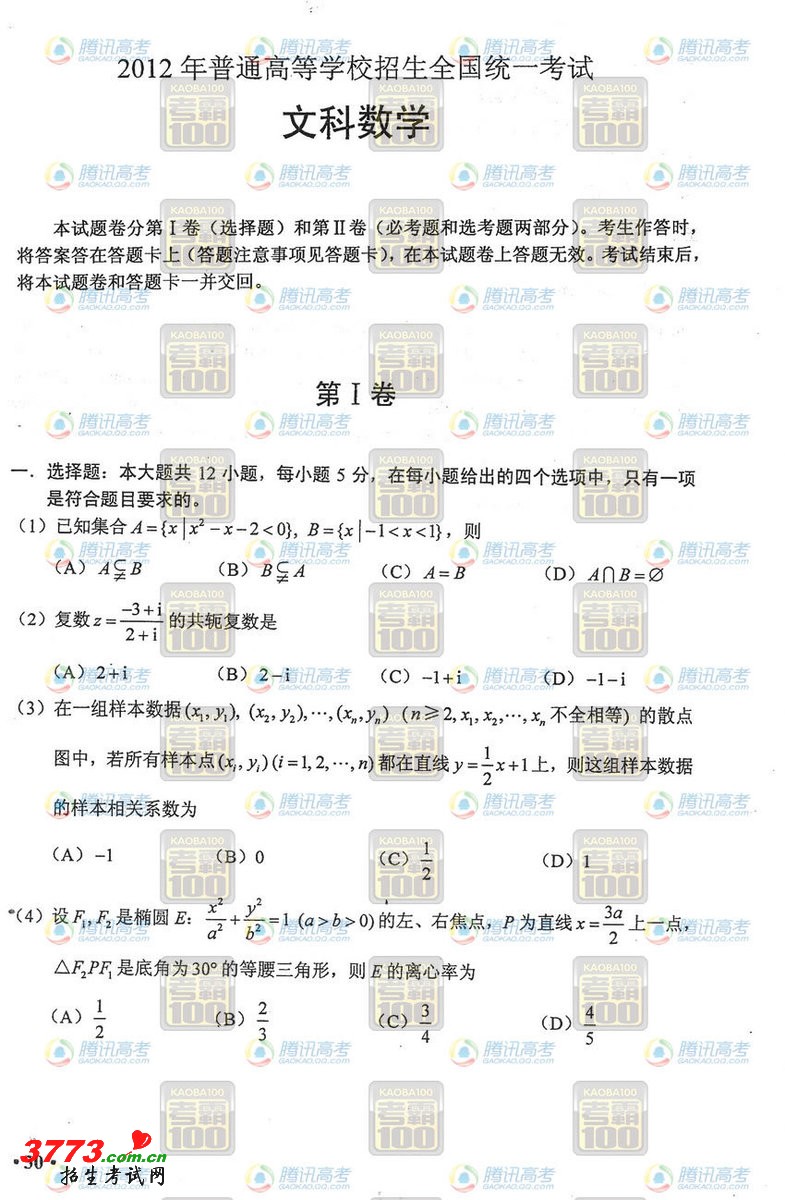 2012年山西高考数学文科试题答案(新课标全国卷)