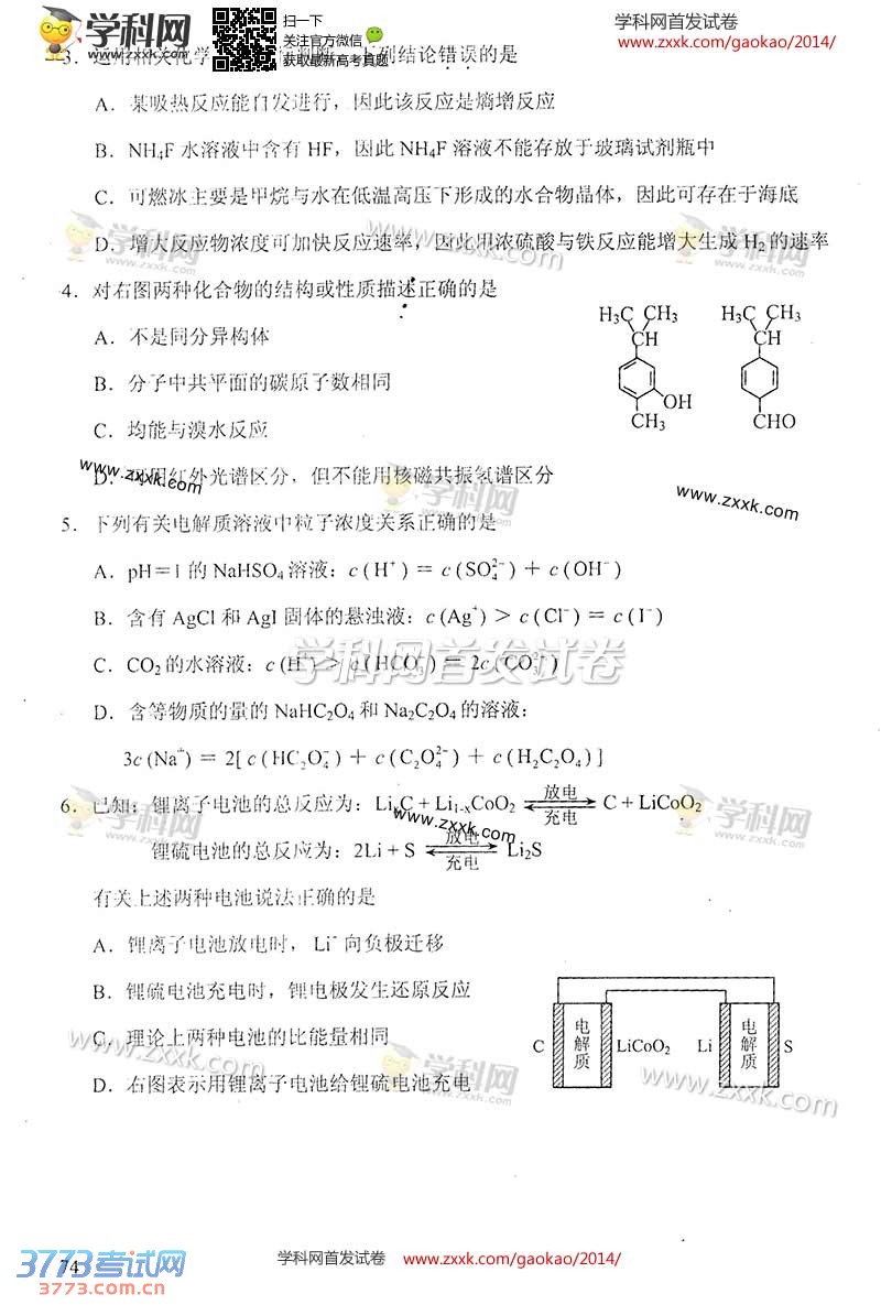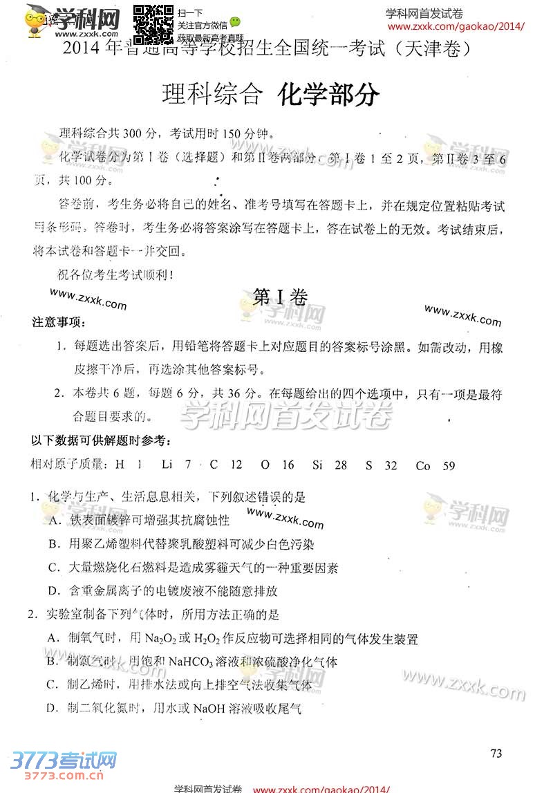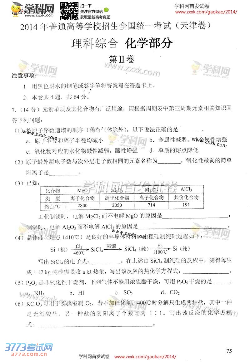 [组图]2014天津高考理综化学试题及答案