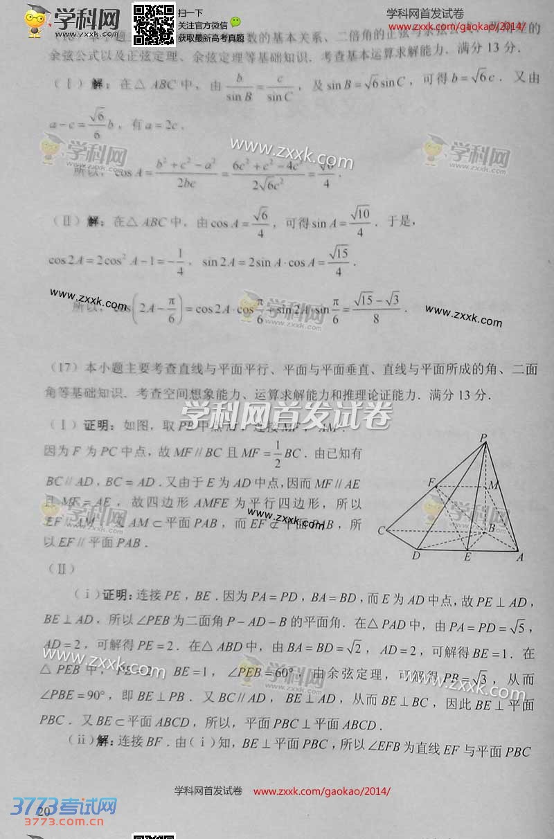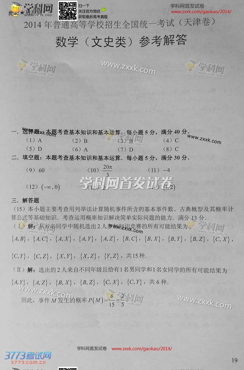 [组图]2014天津高考文科数学答案发布