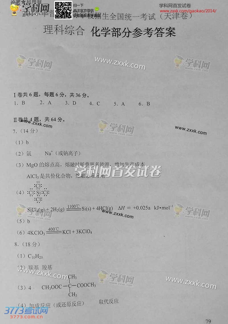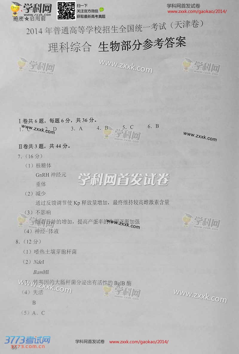 [组图]2014天津高考理综试题及答案发布