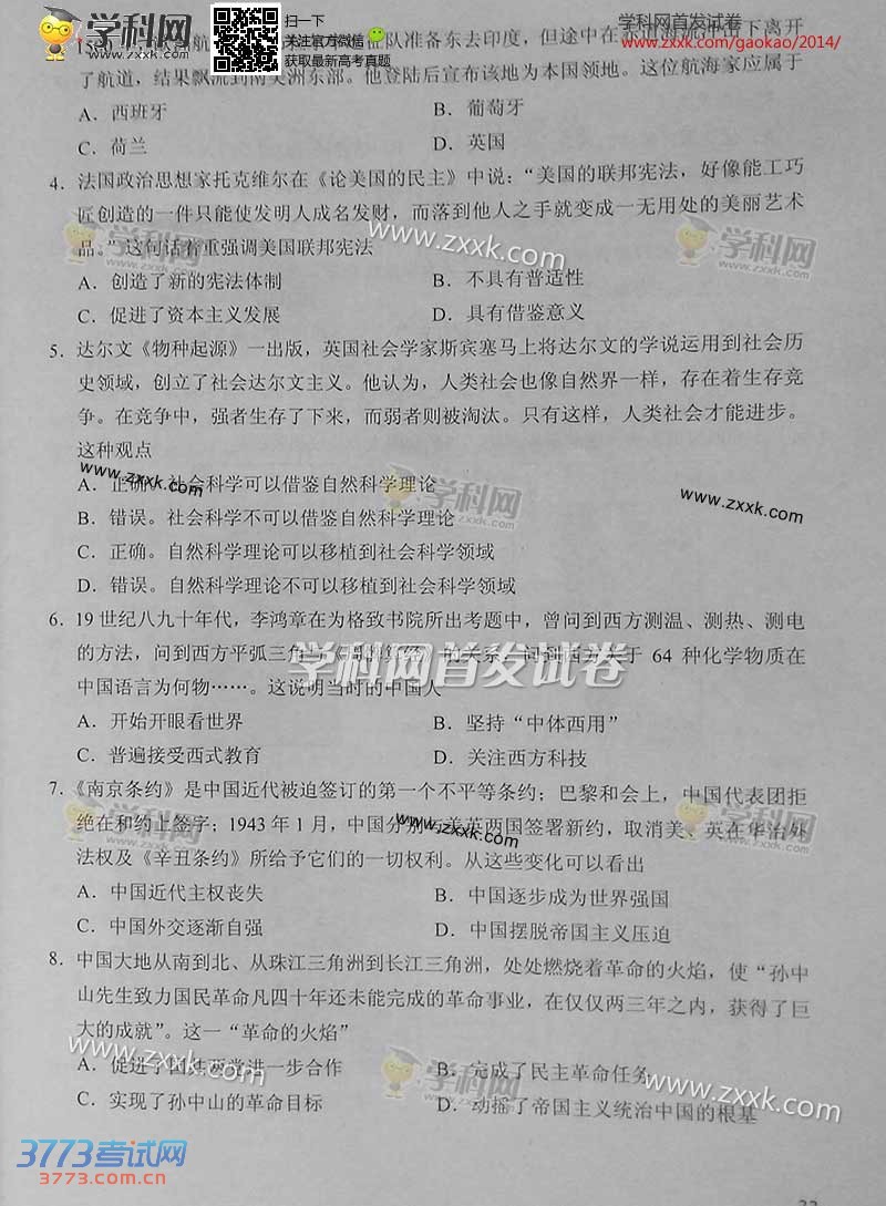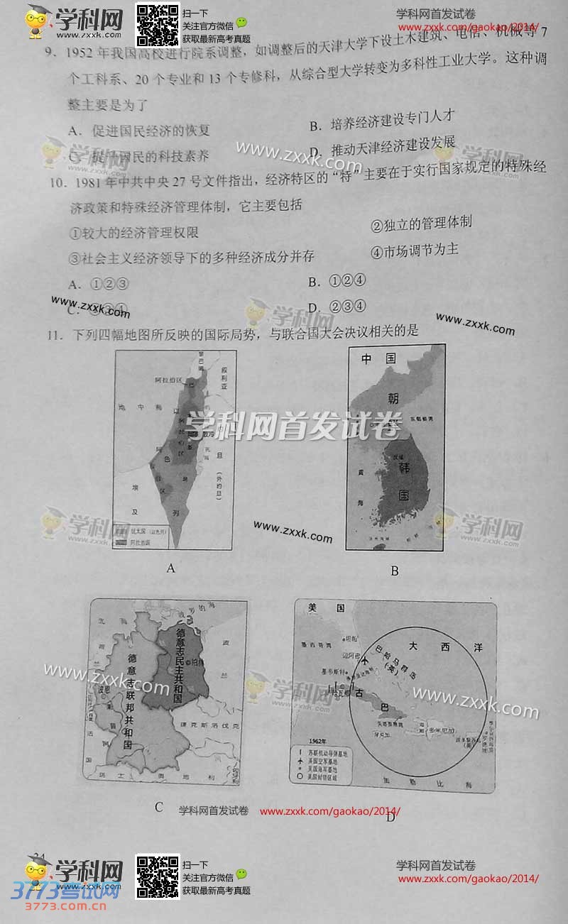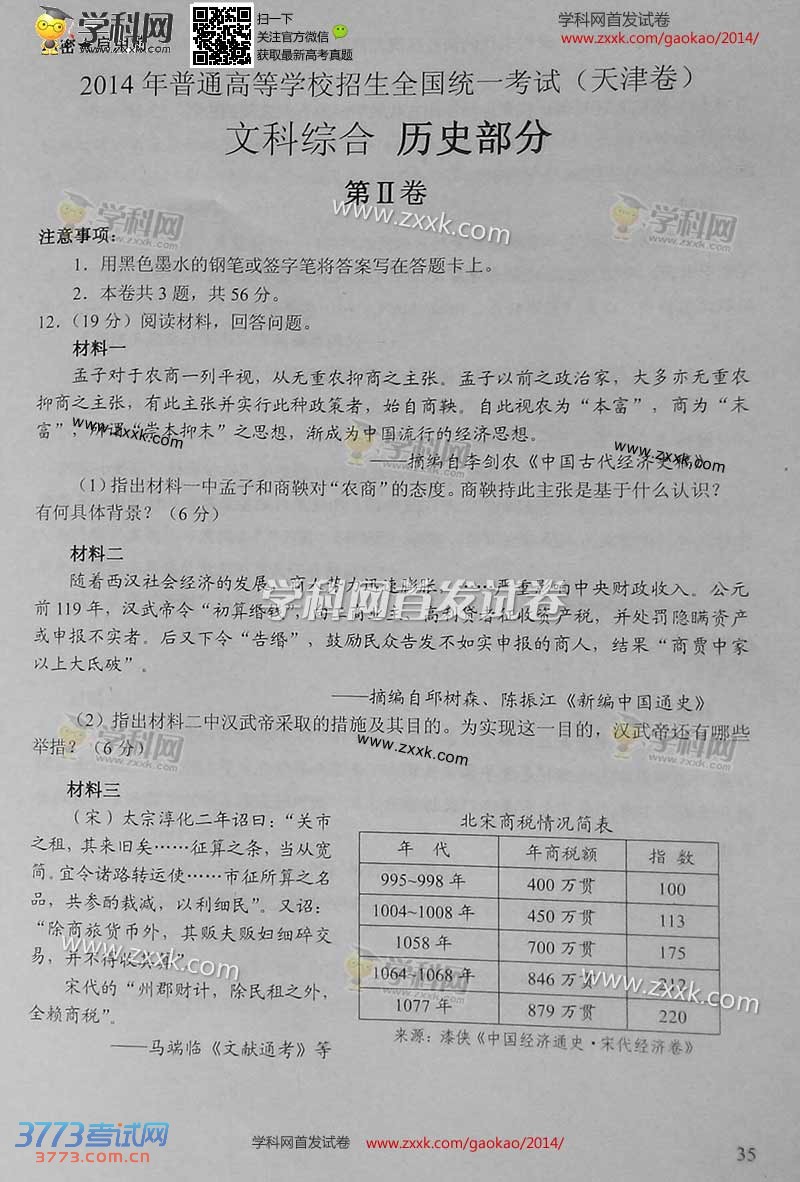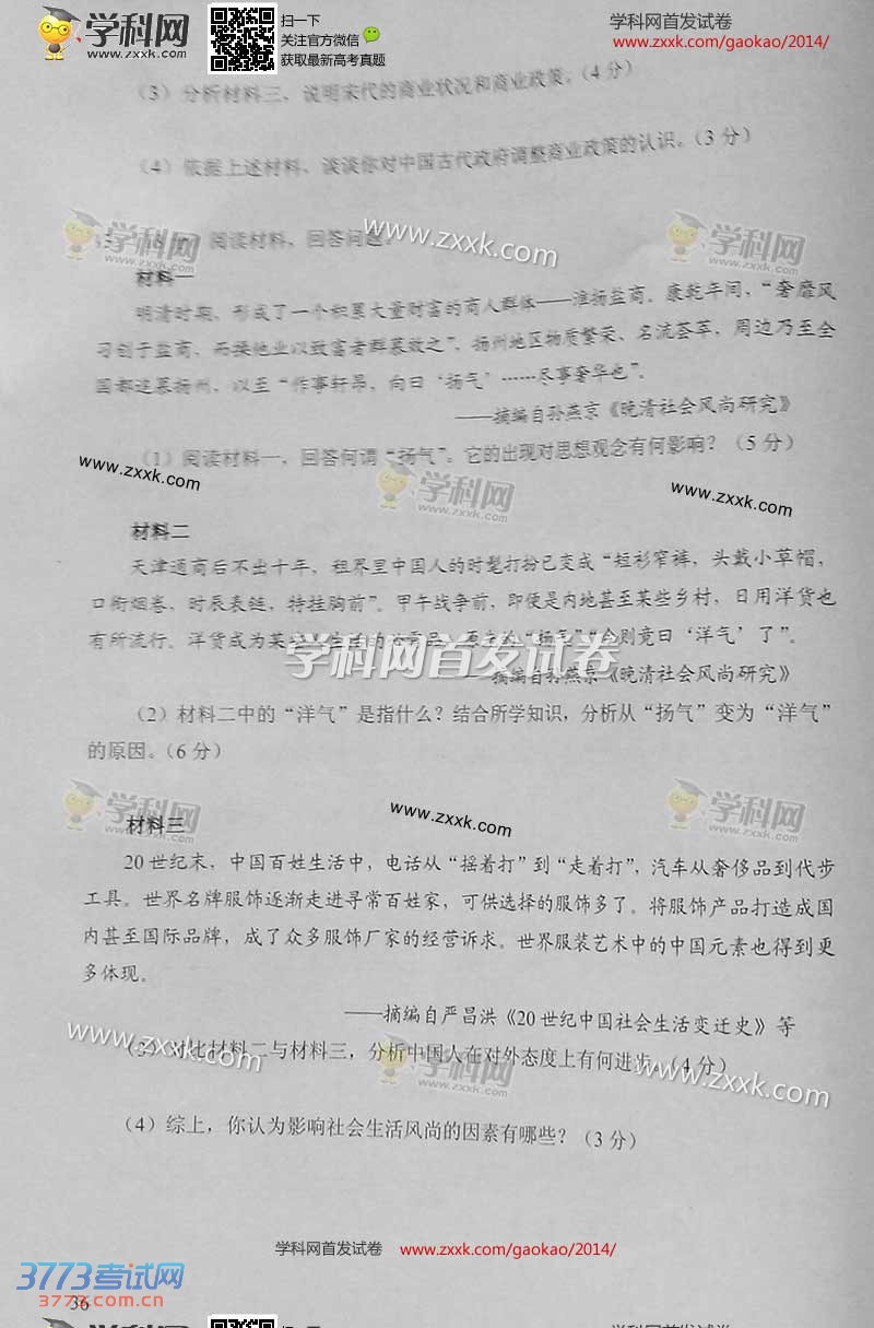 [组图]2014天津高考文综试题及答案发布