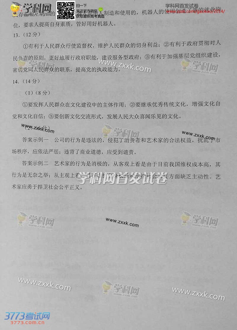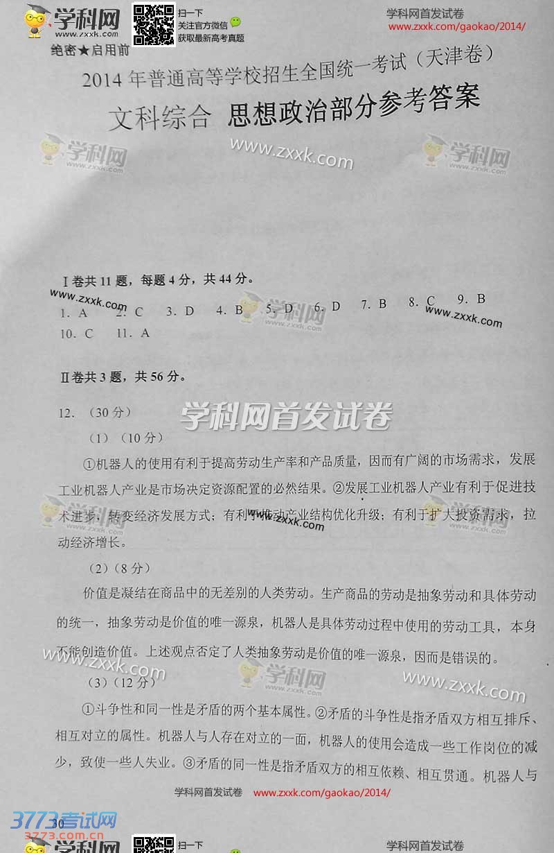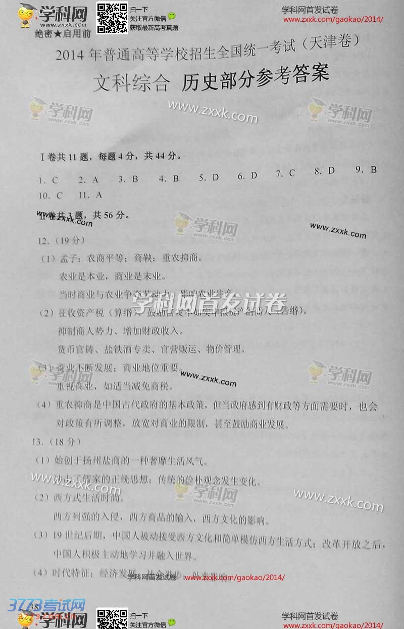 [组图]2014天津高考文综试题及答案发布