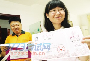 昨日11时许,记者跟随津南区咸水沽邮政速递EMS揽投部的陈师傅来到津南区咸水沽的一处住宅小区,送出一份首批重点本科院校录取通知书。“小外”的尹一铭拿到清华大学录取通知书时,这个戴着眼镜、长相文静的女孩露出了甜美的微笑。