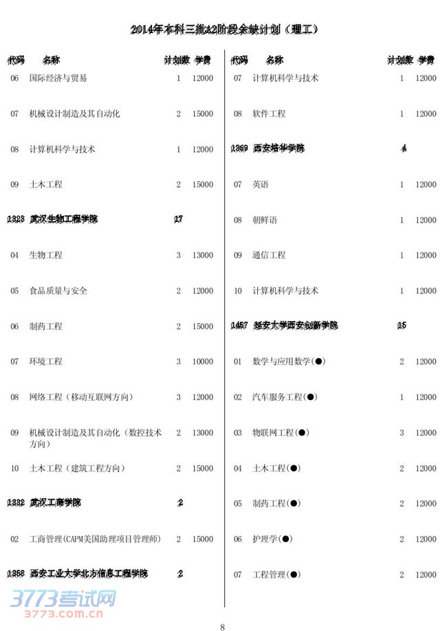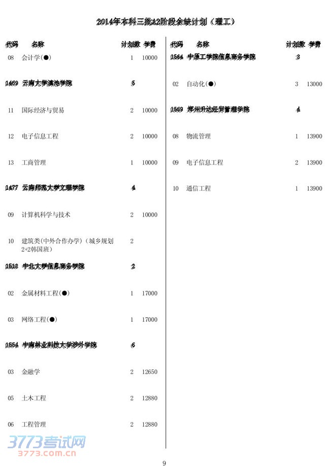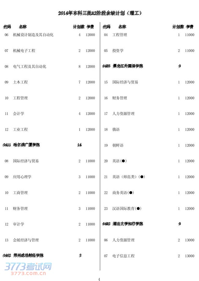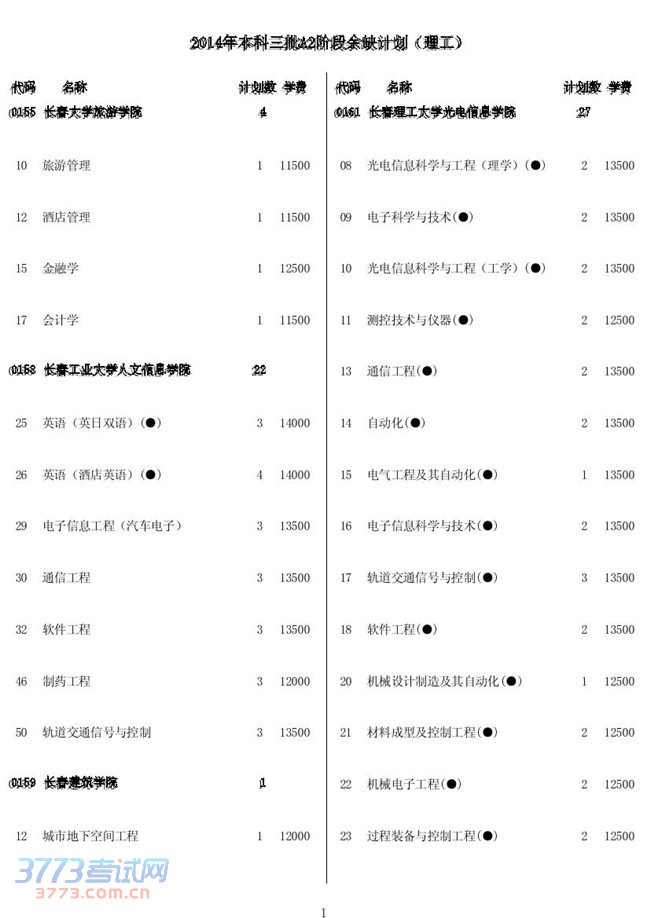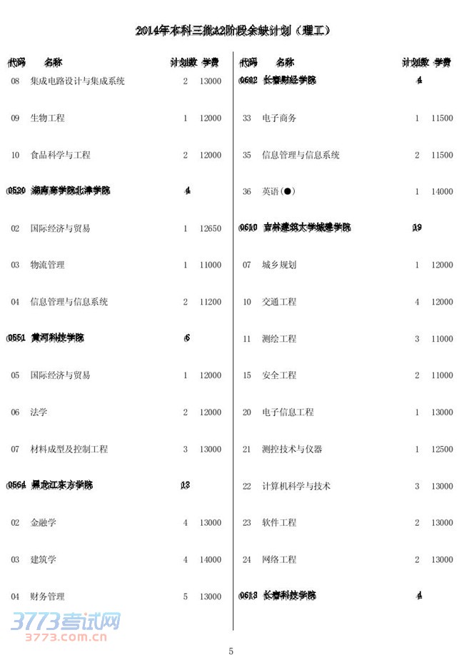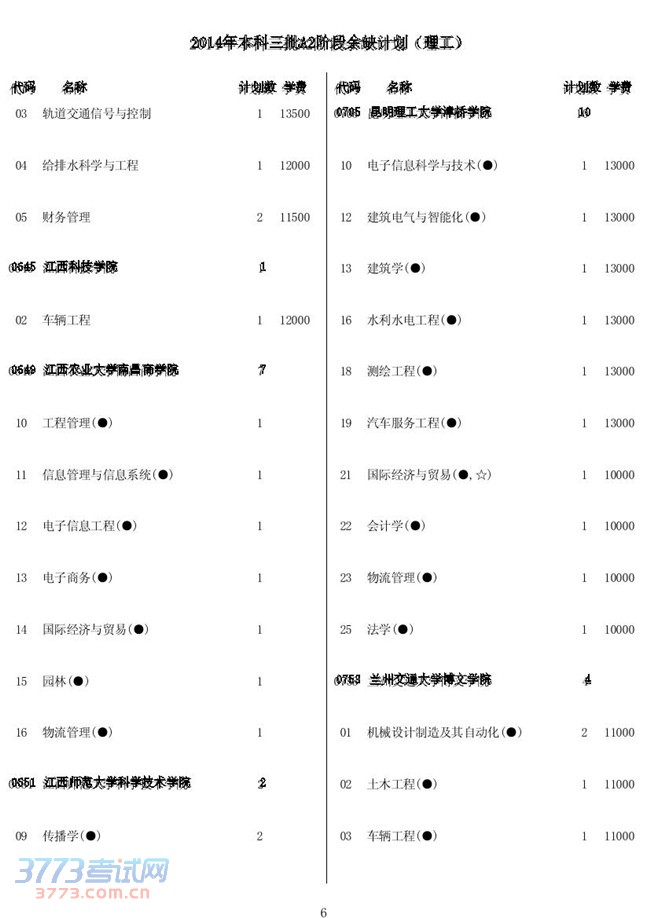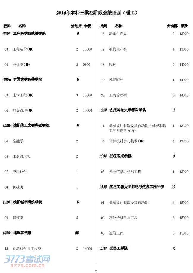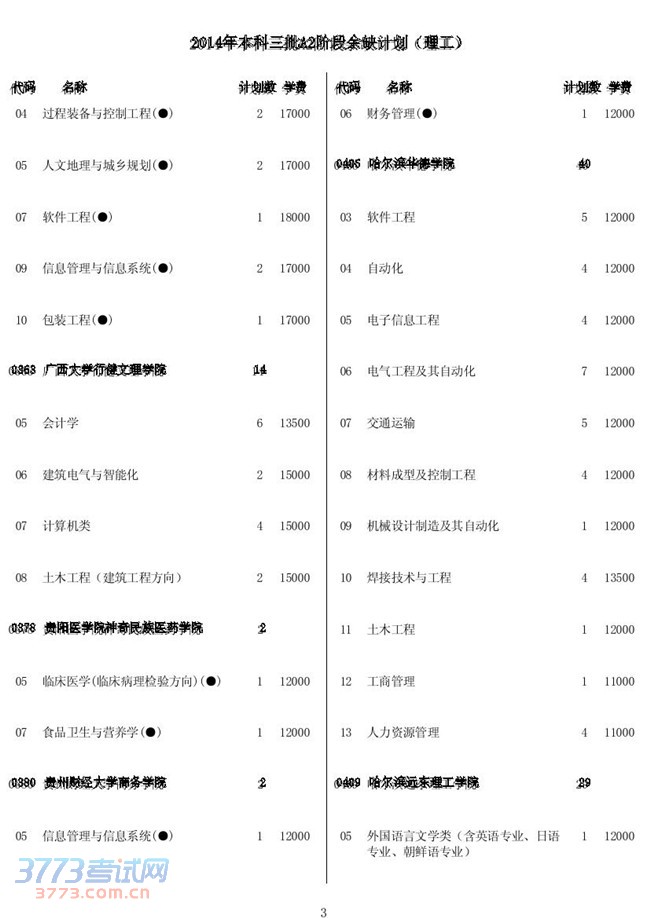 [组图]2014天津高考三本A2理科院校余额计划(54所-余缺436)