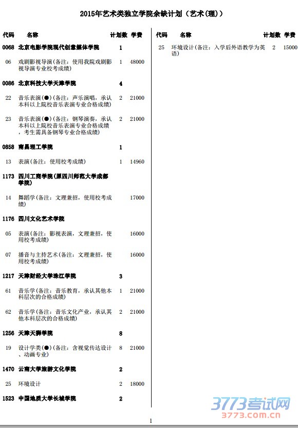 2015年艺术类独立学院余缺计划(艺术(理))