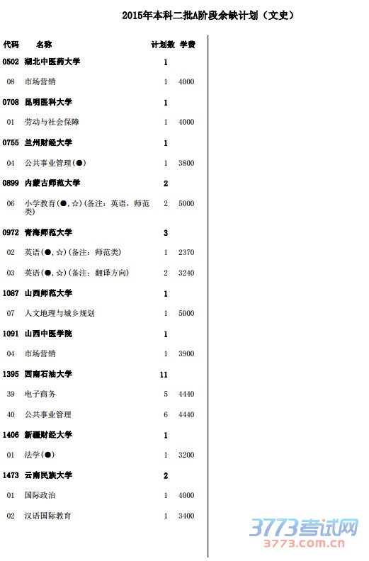2015年本科二批A阶段余缺计划(文史)