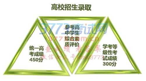二是改革招生录取机制。探索依据统一高考和普通高中学业水平考试成绩、参考高中学生综合素质评价的多元录取机制。从2020年起,统一高考招生录取总成绩由语文、数学、外语3门统一高考科目成绩和3门学生自主选择的普通高中学业水平等级性考试科目成绩构成,作为高校招生录取的基本依据。统一高考招生录取总成绩满分750分。其中,语文、数学、外语每门满分150分,3门普通高中学业水平等级性考试科目每门满分100分。