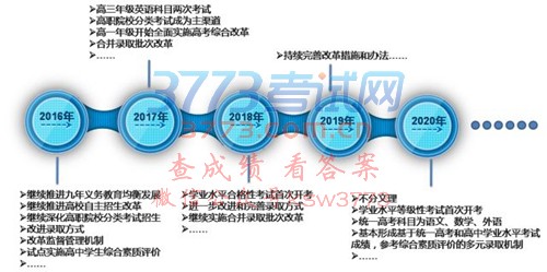 高考改革将分年逐步实施。2016年推进九年义务教育均衡发展、高校自主招生改革、深化高职院校分类考试招生,改进录取方式,改革监督管理机制等,并选择部分区县试点实施高中学生综合素质评价实施办法;2017年实施英语科目一年两次考试,逐步合并录取批次,并从2017年高一年级开始全面实施高考综合改革;2018年将首次组织高中学业水平合格性考试,并继续实施合并录取批次改革;2020年录取不分文理科,首次组织高中学业水平等级性考试,基本形成基于统一高考和高中学业水平考试成绩,参考综合素质评价的多元录取机制。
