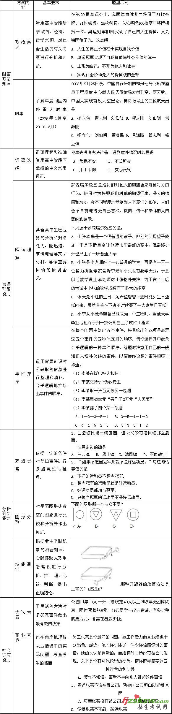 社会适应能力:要求考生具备参加职业教育学习所必须具备的理解能力、创造性思维能力及语言表达能力等。