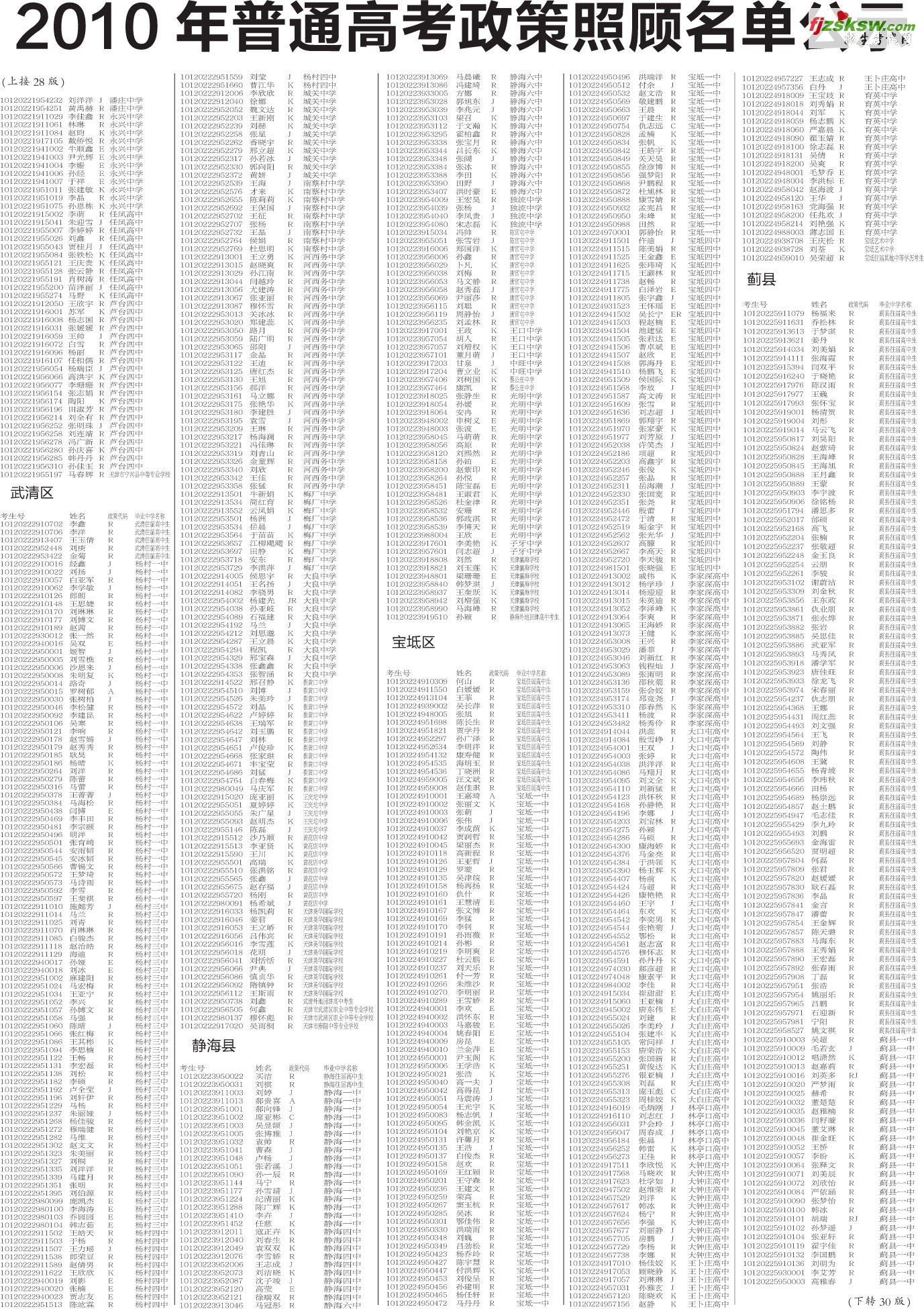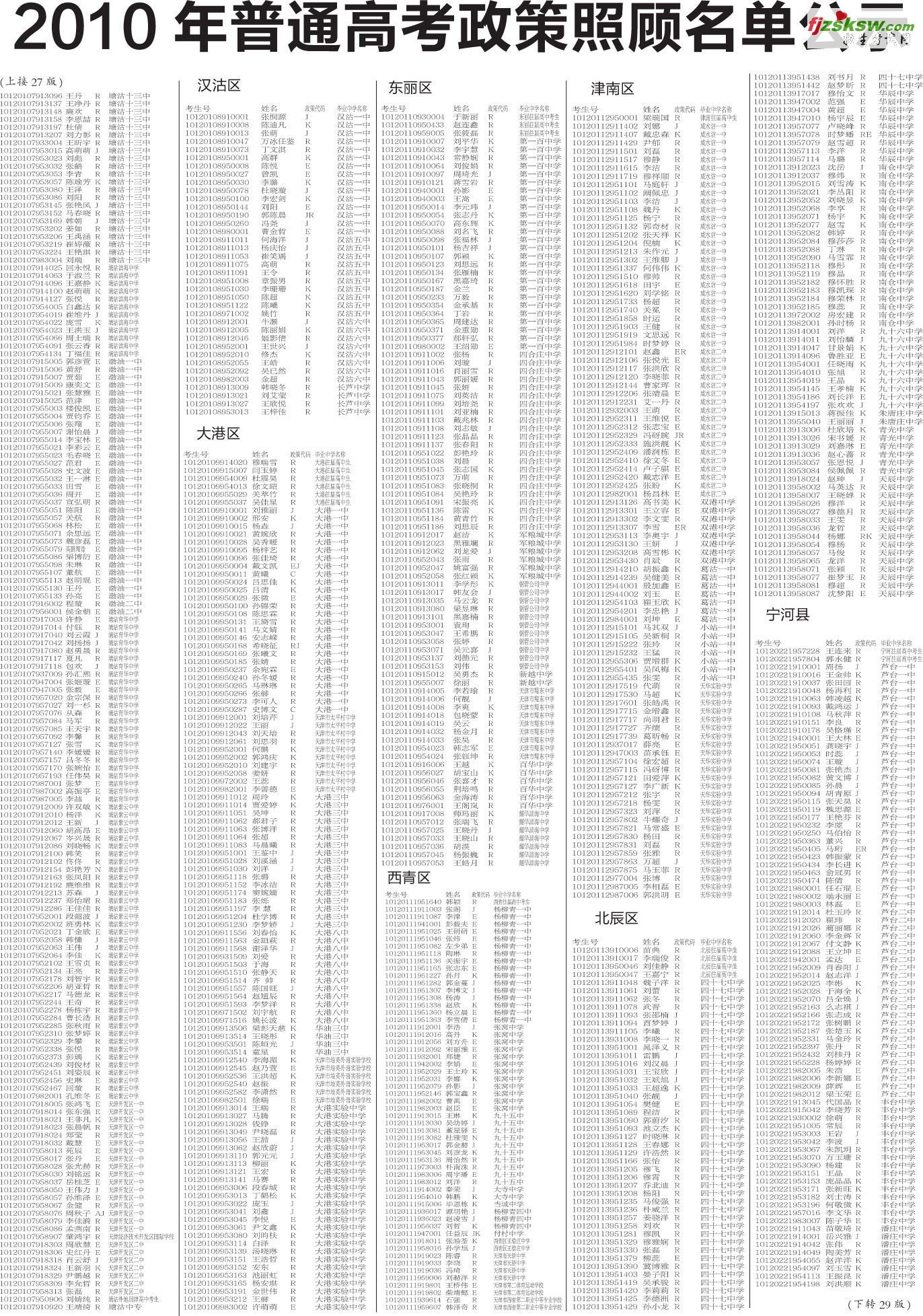[组图]天津各区2010年普通高考政策照顾名单