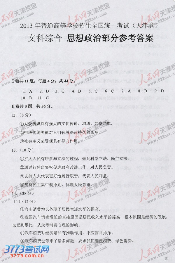 图为2013年普通高等学校招生全国统一考试(天津卷)文科综合思想政治部分参考答案。