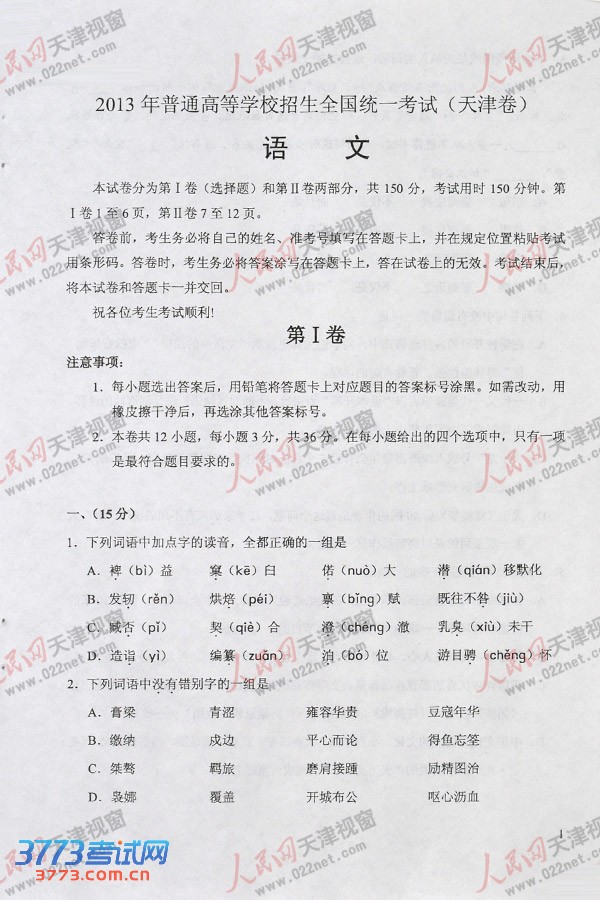 图为2013年普通高等学校招生全国统一考试(天津卷)语文试题第Ⅰ卷。