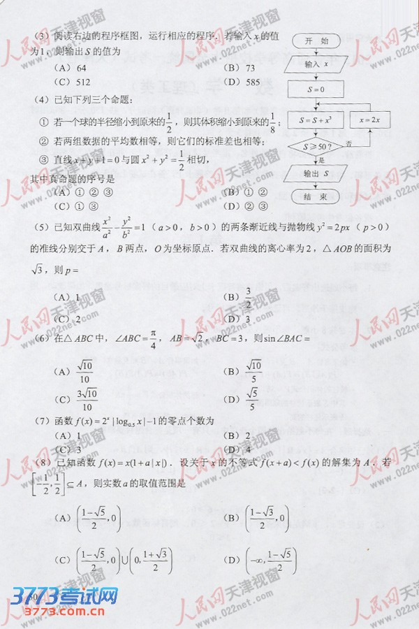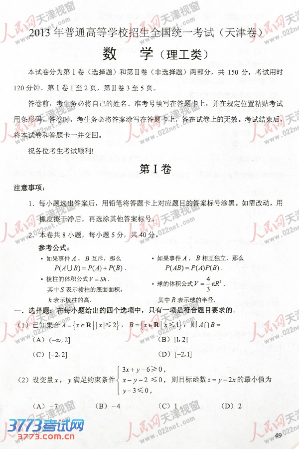 图为2013年普通高等学校招生全国统一考试(天津卷)理工数学I卷。