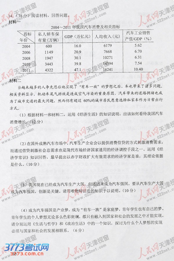 2013高考天津卷文科综合思想政治部分试题第Ⅱ卷