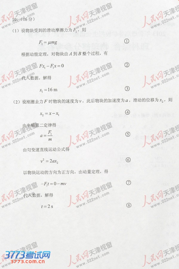 [组图]2013天津高考理综试题答案(物理部分)