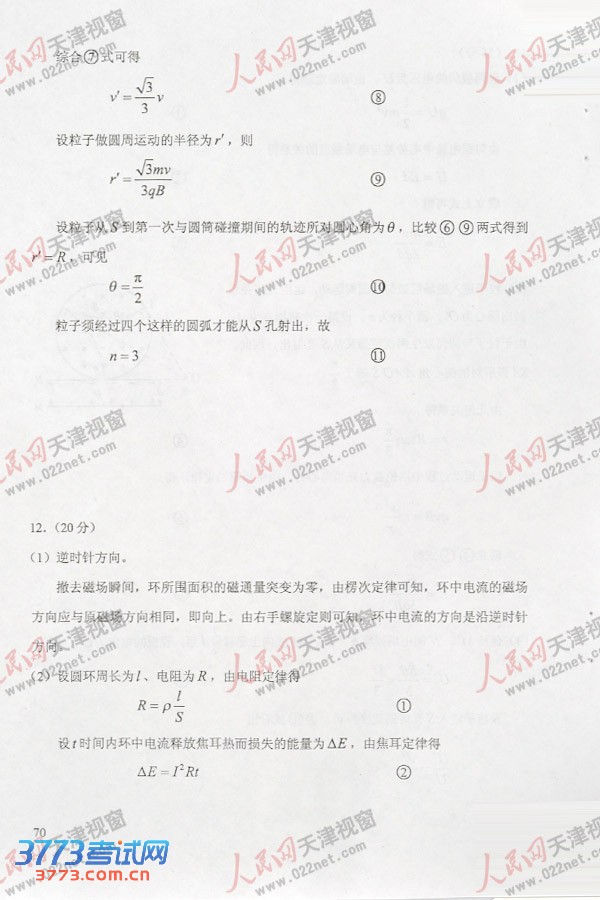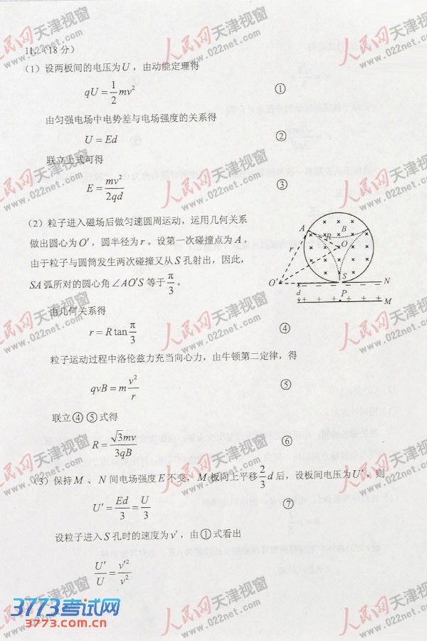 [组图]2013天津高考理综试题答案(物理部分)