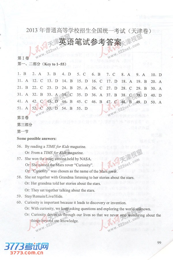2013年普通高等学校招生全国统一考试(天津卷)英语笔试参考答案