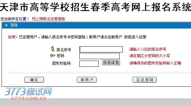 说明:已注册用户,请输入报名序号与密码登陆;新用户请点击新用户 按钮进入注册