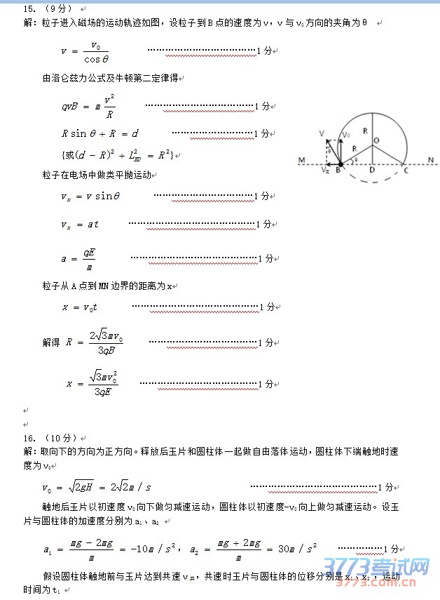 解:取向下的方向为正方向。释放后玉片和圆柱体一起做自由落体运动,圆柱体下端触地时速度为v0