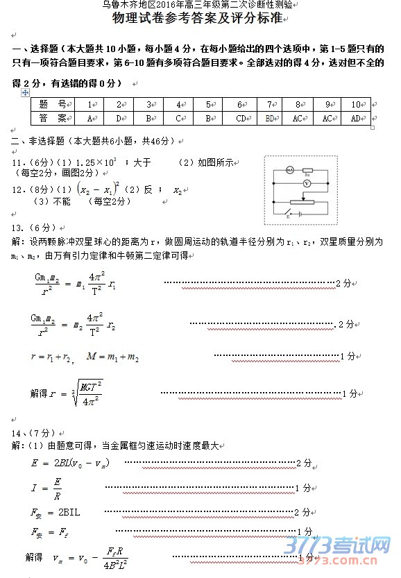 乌鲁木齐地区2016年高三年级第二次诊断性测验