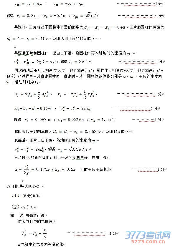 共速后玉片和圆柱体一起自由下落,设圆柱体再次触地时的速度为v3