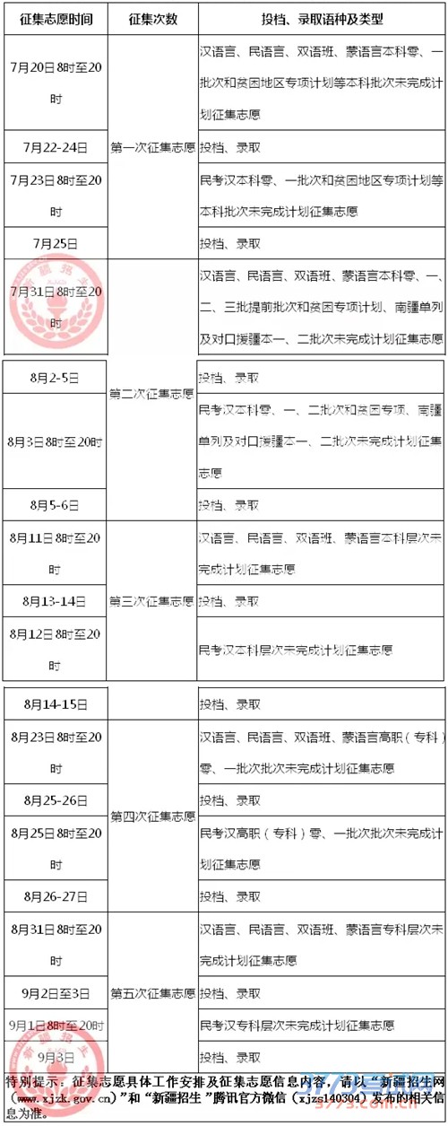 2015年新疆将继续对各批次未完成计划实施网上公开征集志愿,具体征集志愿时间安排如下: