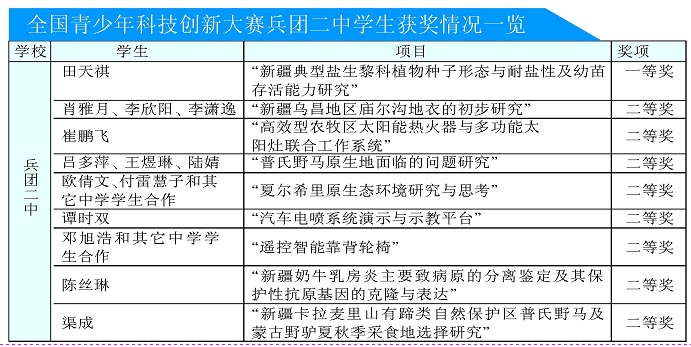 据了解,从2002年开始,新疆高中生开始在“青科赛”中获得保送资格,截止到2009年,共有41名学生通过大赛获保送,其中兵团二中就占了23名。