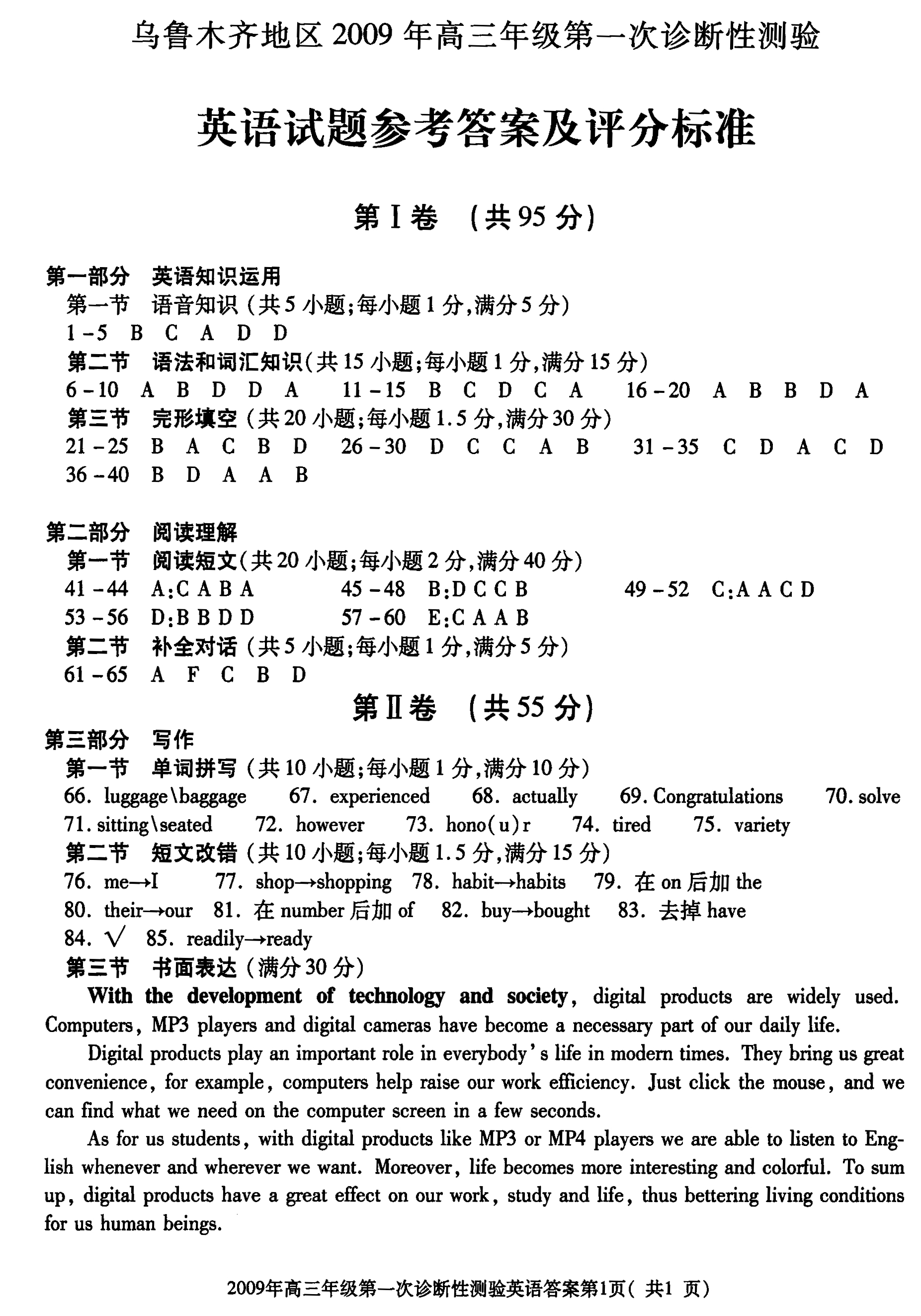 [图文]2009年乌鲁木齐高三一模英语试卷答案及评分标准