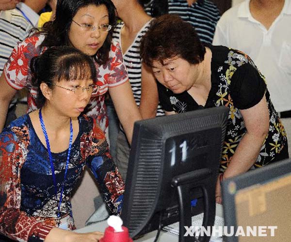 7月15日,考生家长代表在新疆维吾尔自治区招生办公室5楼的录取工作现场浏览相关信息。新华社记者沙达提摄