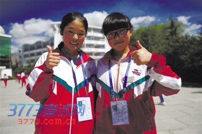 今年高考首场结束后,拉萨中学考点两考生喜竖大拇指。