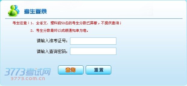 考生注意:1、全省文、理科前50名的考生分数已屏蔽,不提供查询;