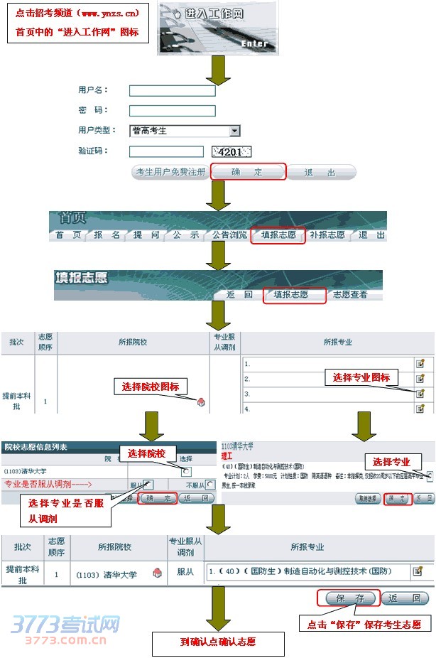 在填报截止时间之前,考生登录工作网(www.ynzs.cn或www.ynzk.cn),自行进行志愿填报;在确认截止时间之前,考生携带准考证到确认点进行确认、签字,完成志愿填报。