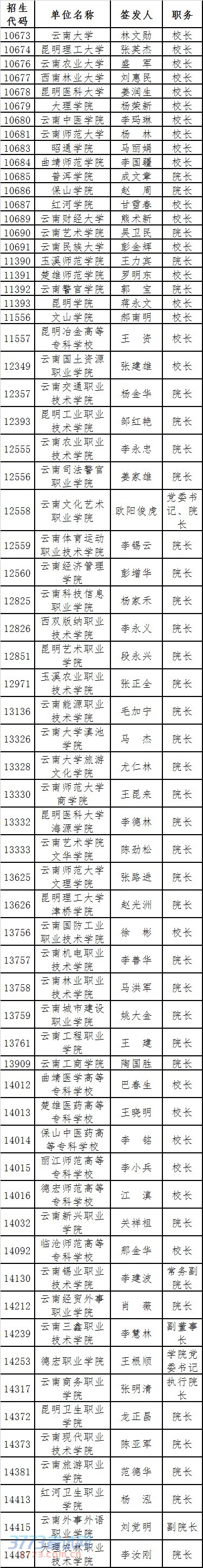 录取通知书是考生录取和报到的重要凭证。根据《教育部关于做好2014年普通高校招生工作的通知》(教学〔2014〕1号)和《教育部办公厅做好2014年全国普通高校招生录取工作的通知》(教学厅〔2014〕2号)“高校要建立校长作为高校法人代表签发或授权签发录取通知书的制度,由高校主管部门公布高校录取通知书签发人名单”的要求,现将2014年云南省普通高等学校录取通知书签发人名单公告如下:
