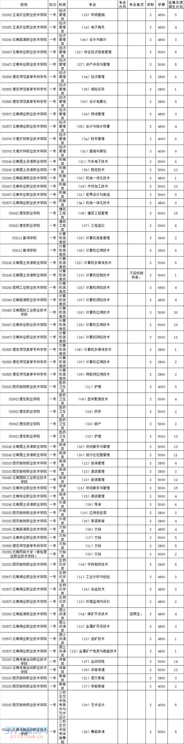 2014年云南省普通高校招生三本预科及一专文科、理科、三校生三次征集志愿招生计划