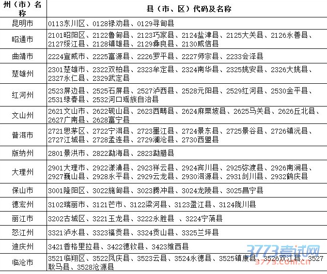 2015年云南省农村学生单独招生(简称高校专项计划) 实施区域代码表