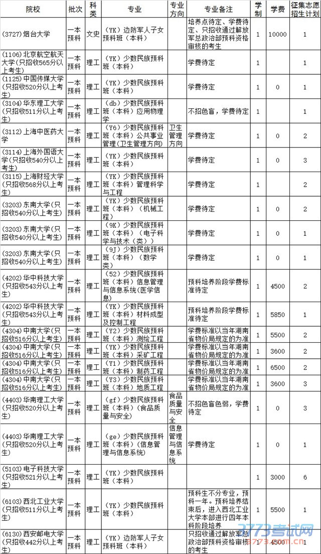 2015年云南省普通高校招生一本预科征集志愿招生计划