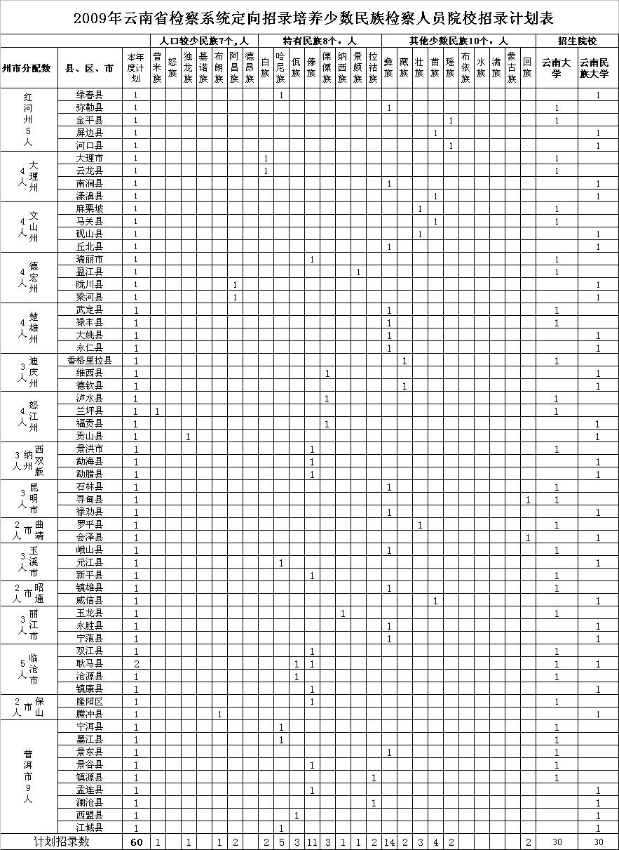 根据《2009年云南省检察系统定向招录培养少数民族检察人员招生简章》、《2009年云南省检察系统定向招录培养少数民族检察人员招生工作实施办法》,2009年云南省检察系统定向招录培养少数民族检察人员招生计划数为60人,云南大学和云南民族大学计划各招录30人,为方便考生填报志愿,现将云南大学和云南民族大学的招录计划公布如下:
