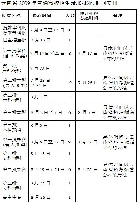 据省招考办的安排,文、理科各批次中,共安排了5个志愿补报时间:7月17日为一本补报,7月26日为二本补报,8月5日为三本补报,8月12日为一专补报,8月22日为二专补报。分数达相应批次录取线,但因志愿原因而未被录取的考生,可在相应的批次补报志愿。