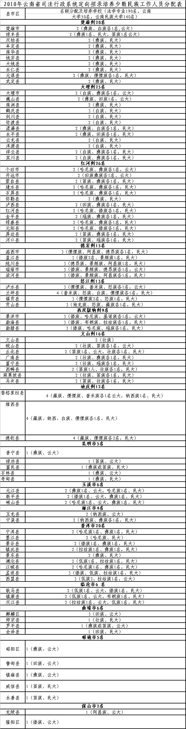 2010年云南省司法行政系统定向招录培养少数民族工作人员招生计划数为190人。文理兼收,择优录取。具体定向单位、民族分配、招生院校按本简章附表内容执行。定向单位为我省少数民族地区及边疆贫困地区的基层司法所。