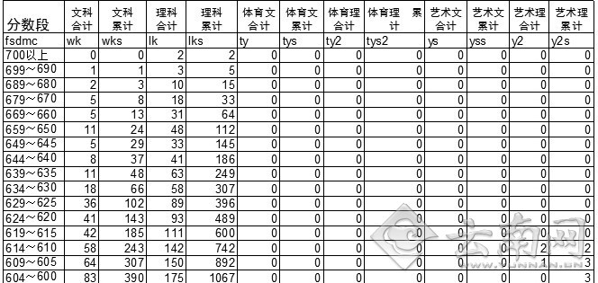 文理科600分以上分数段统计(摘自云南省招考频道)