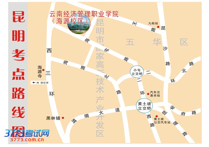 昆明考点交通:到昆明后请乘2 路、26 路、55 路、70 路、83 路、90 路、106 路、116 路、127 路、133 路、138 路、146 路、168 路、C16 或C61 路等公共汽车到黄土坡转乘113(昆师路口←→海源寺)或C63 路公共汽车直接到云南经济管理学院考点。