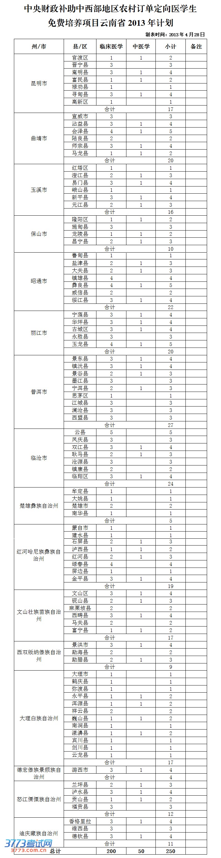 [图文]2013年云南高考定向医学生招生计划