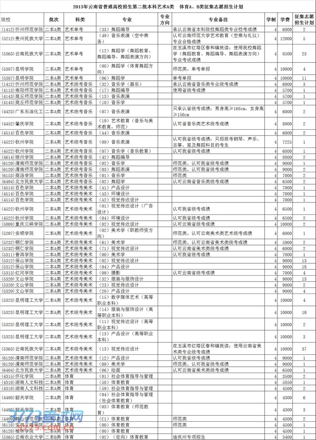 [图文]2013云南高考二本艺术A类体育AB类征集志愿招生计划