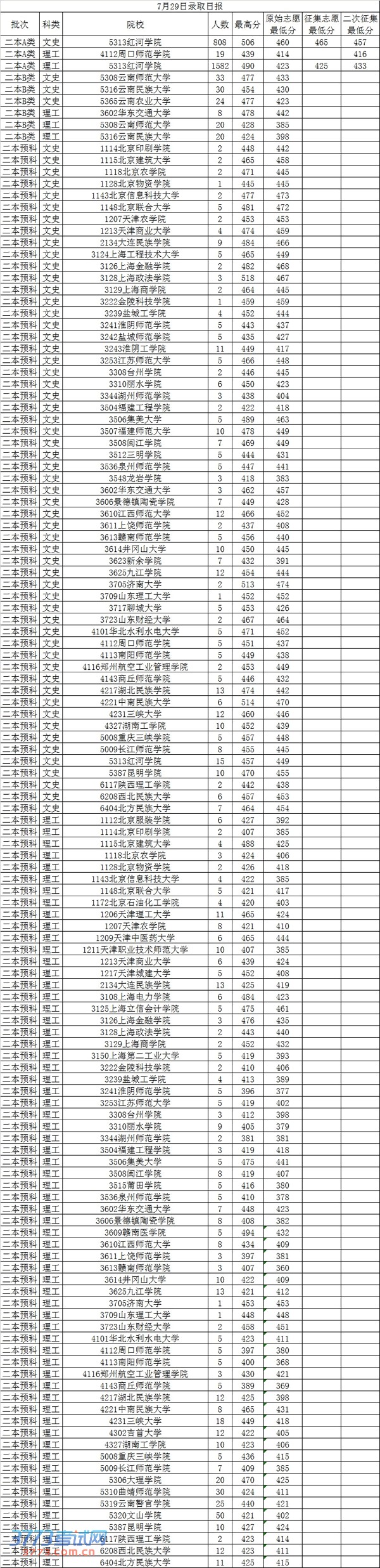 [图文]2013年7月29日云南高考录取分数线日报