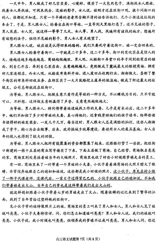 19.(4分)一是推动故事情节的发展。第一处“男人和女人”带着娃走出大山,才有了后来创业、娃丢失等情节;第二处“小伙子和媳妇”带着娃走出大山,才有了一家人最终团圆的情节。(2分)二是结构上前后呼应,相似的生活经历形成“巧合”,使故事富有戏剧性,更能吸引读者,收到了意料之外、情理之中的效果。(2分)