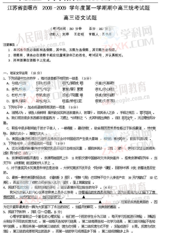 江苏姜堰第一学期期中高三统考试题(语文)