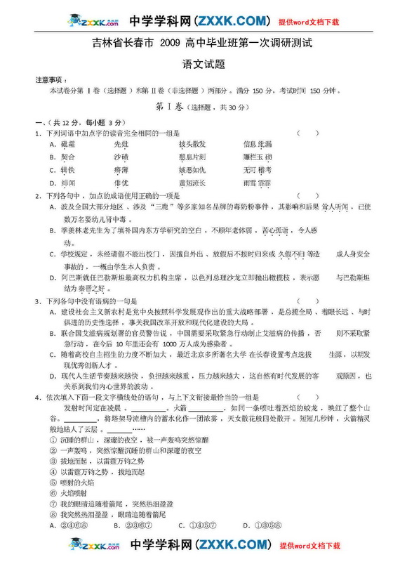 吉林长春市09届高三第一次调研测试-语文