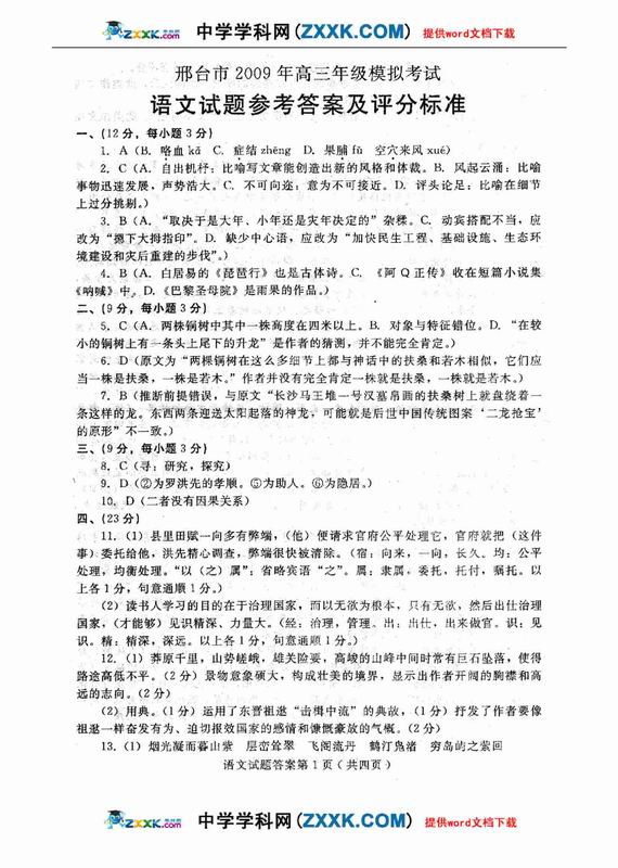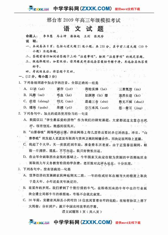 河北省邢台市09届高三模拟考试-语文