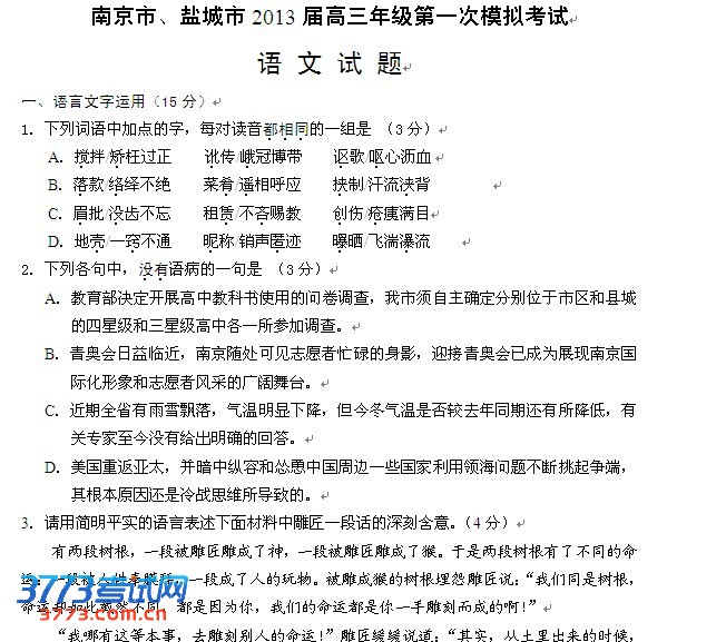 南京盐城2013年高考语文一模考试试题:点击免费下载。