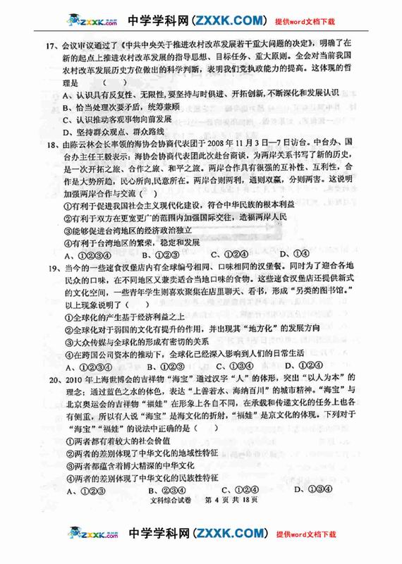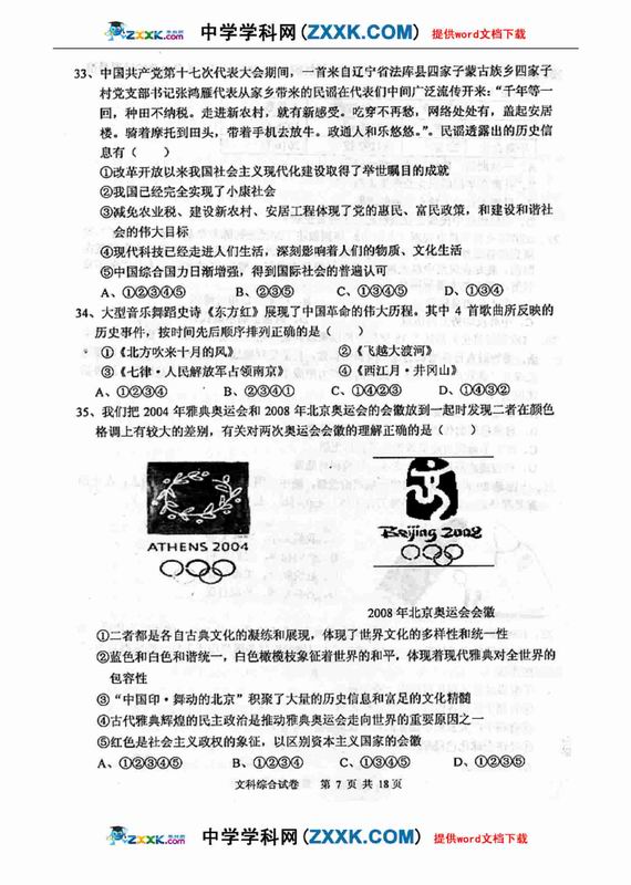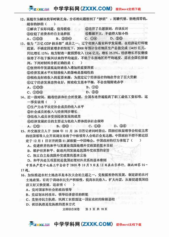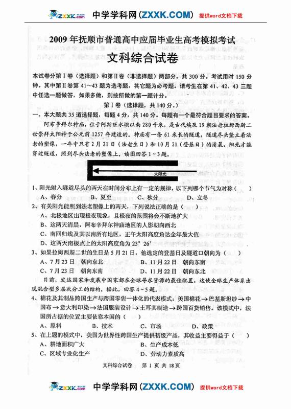 09年抚顺市高中应届毕业生高考模拟文综